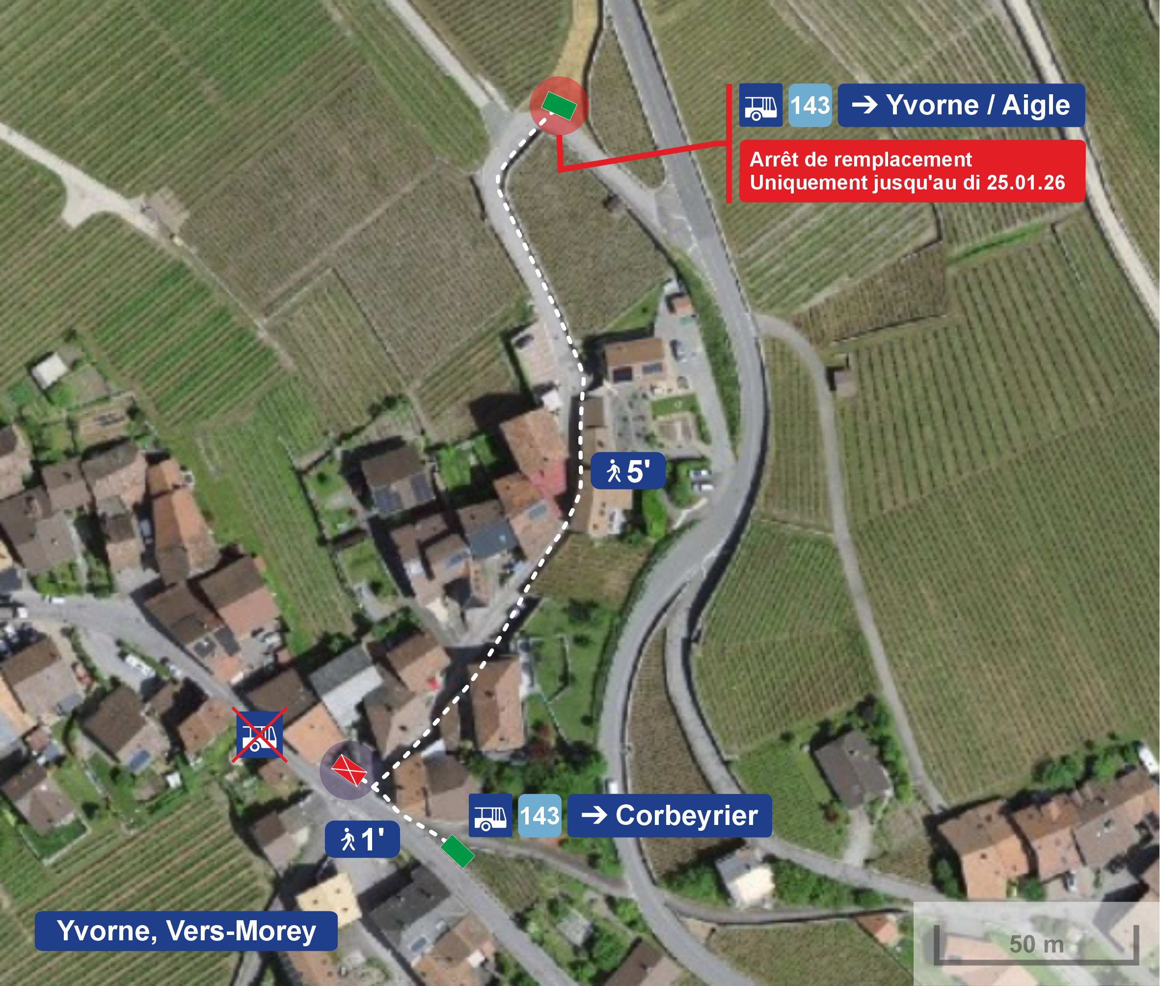 Aigle-Corbeyrier | Perturbation du trafic routier et déplacement de l’arrêt à Vers-MoreyEn raison de travaux dans le hameau de Vers-Morey, le trafic routier est perturbé du lundi 26 janvier au vendredi 3 juillet 2026 compris.