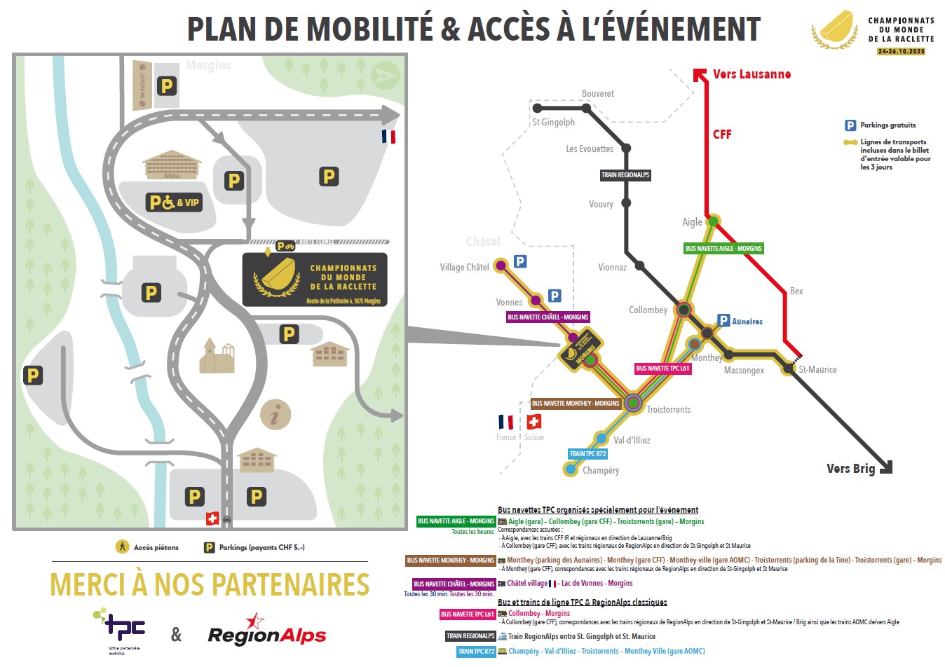 Votre billet d’entrée valable pour les 3 jours de l’événement, inclut les lignes de transports publics indiquées en jaune dans le plan de mobilité ci-dessous.