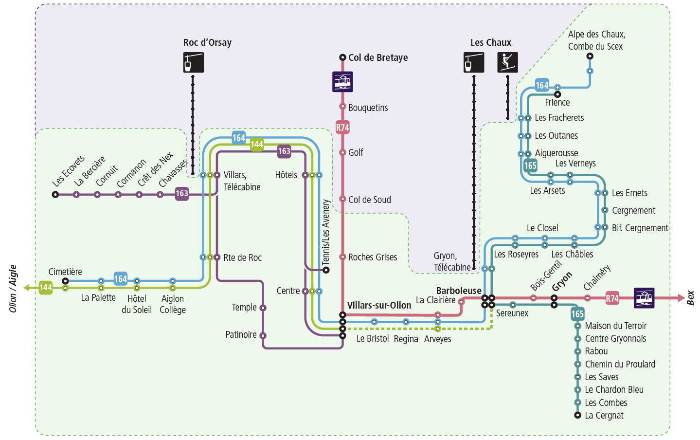 RELIE Bex à Gryon en 25 minutes, Bex à Villars en 45 minutes et Villars au Col de Bretaye en 18 minutes